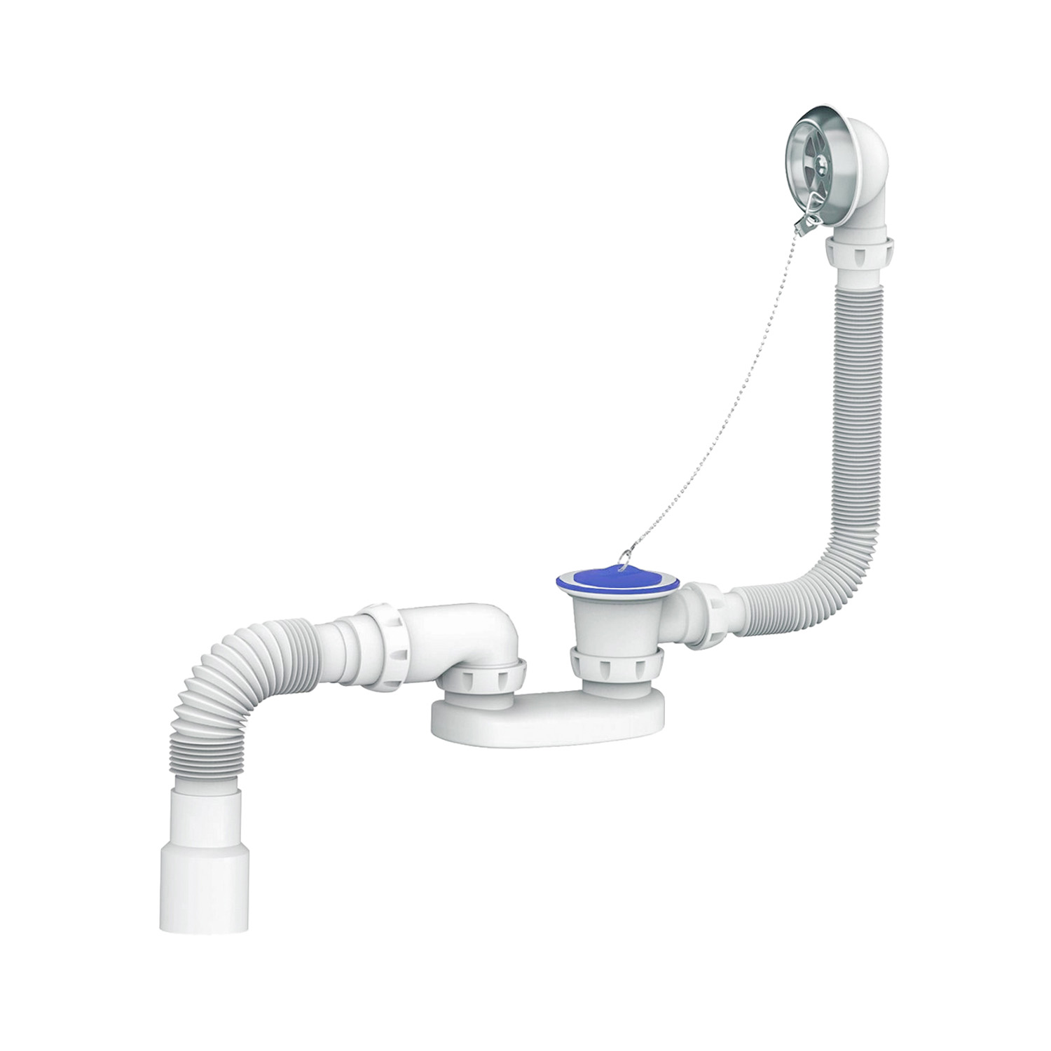Сифон для ванны и глубокого поддона, перелив, винты 6х40, чашки из нержавеющей стали, пробка, цепочка, гибкий отвод в канализацию Ø40хØ40/50 400 мм.