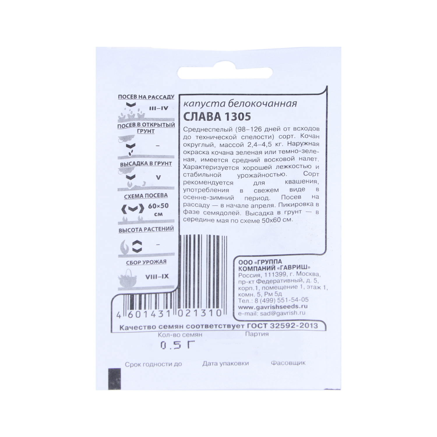 Семена Капуста б/к Слава 1305 0,1гр Гавриш БЕЛ *20/500