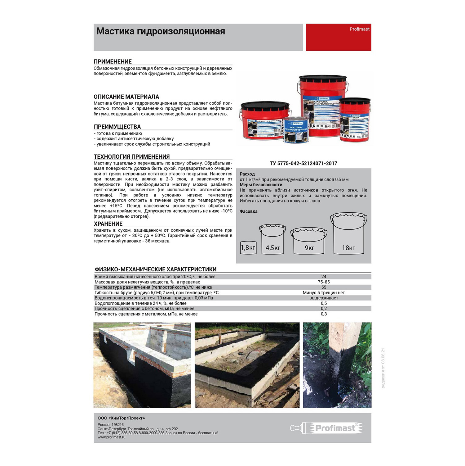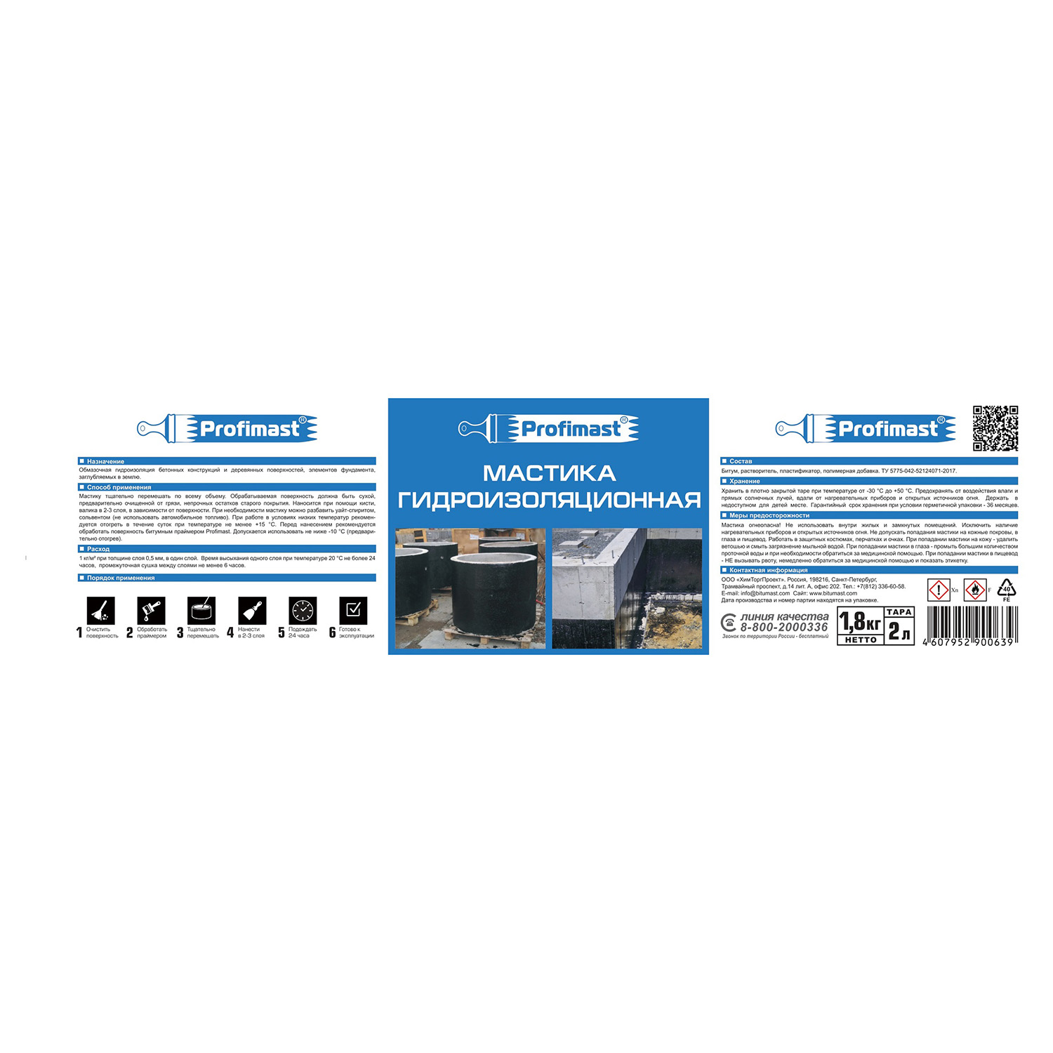 шт кгМастика битумная гидроизоляционная Profimast 2 л представляет собой полностью готовый к применению продукт на основе нефтяного битума, содержащий технологические добавки и растворитель.