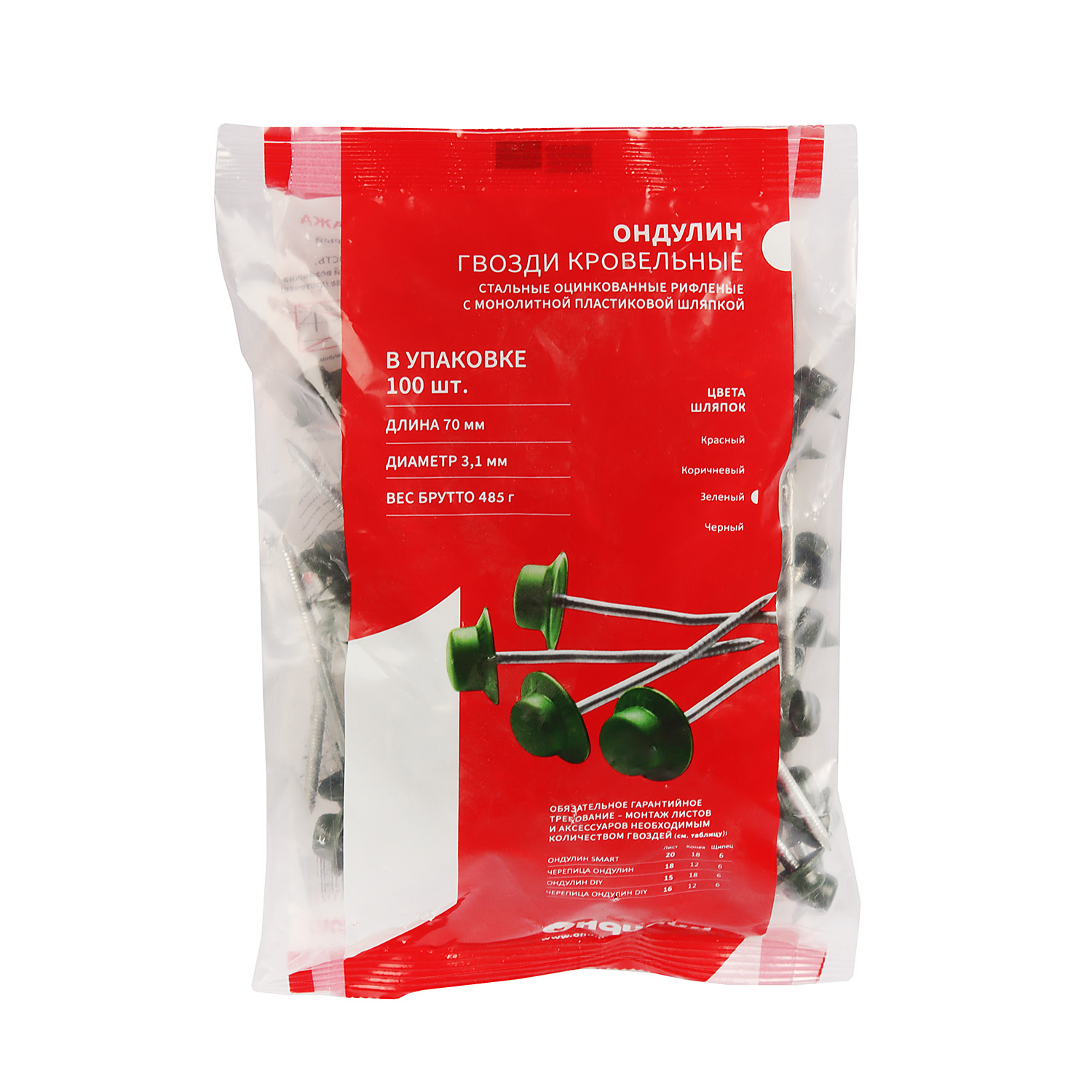 Гвозди Ондулин зеленые обеспечивают надежное крепление кровли, герметизацию и исключительную устойчивость к воздействию ветра. Подходят для: листов Ондулин Смарт, черепицы Ондулин, Ондувиллы.