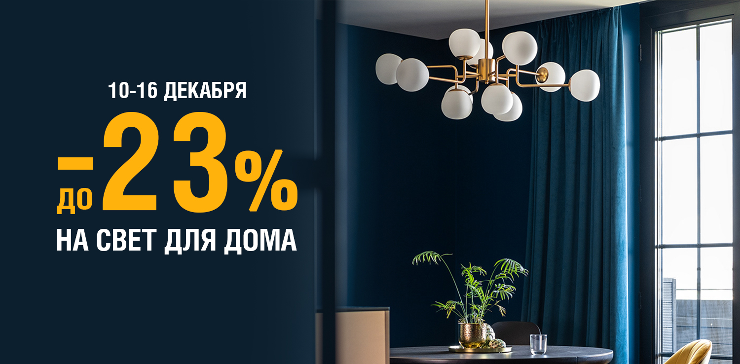 Распродажа света для дома в сети Домострой! С 10 по 16 декабря при заказе на сайте — скидка до 23% на освещение для дома. Это отличная возможность обновить люстру, бра или светильники по привлекательным ценам!