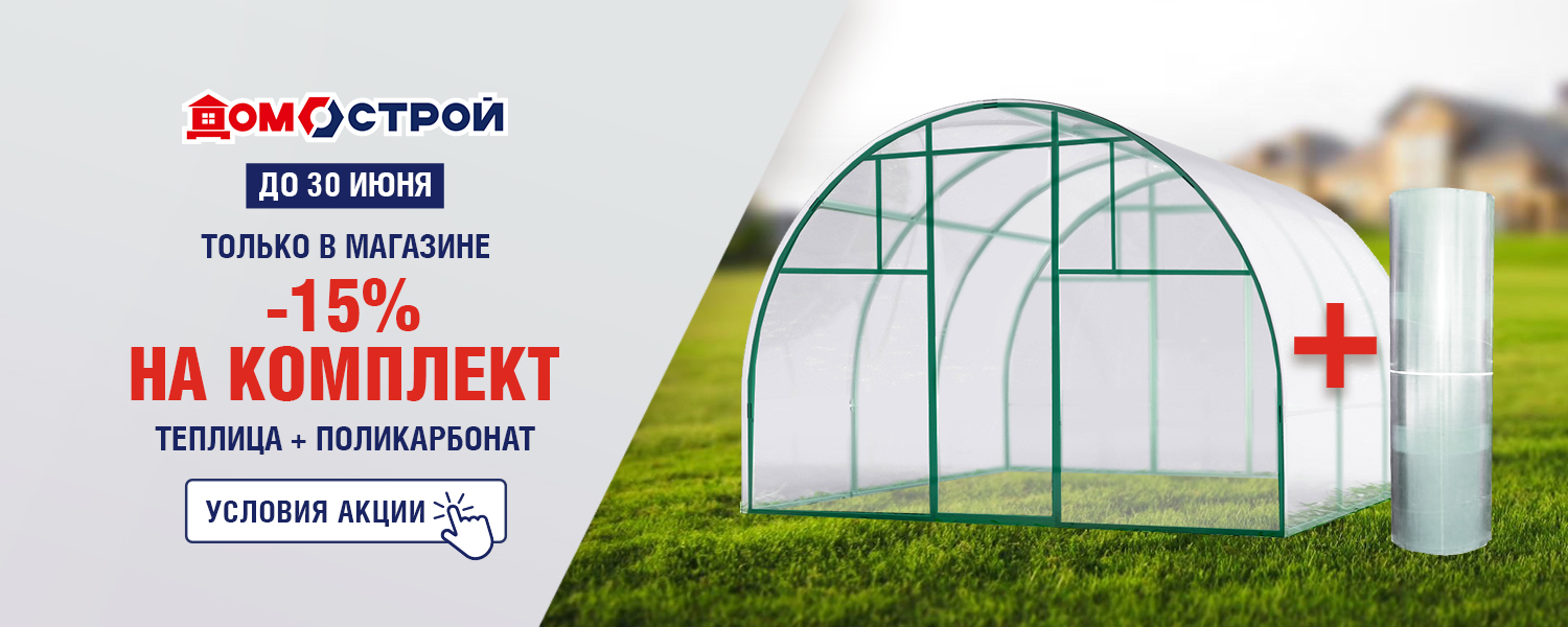 Только до 30 июня в магазине ДомоСтрой скидка -15% на покупку комплекта: каркас теплицы + поликарбонат. Цена действует только в розничном магазине.